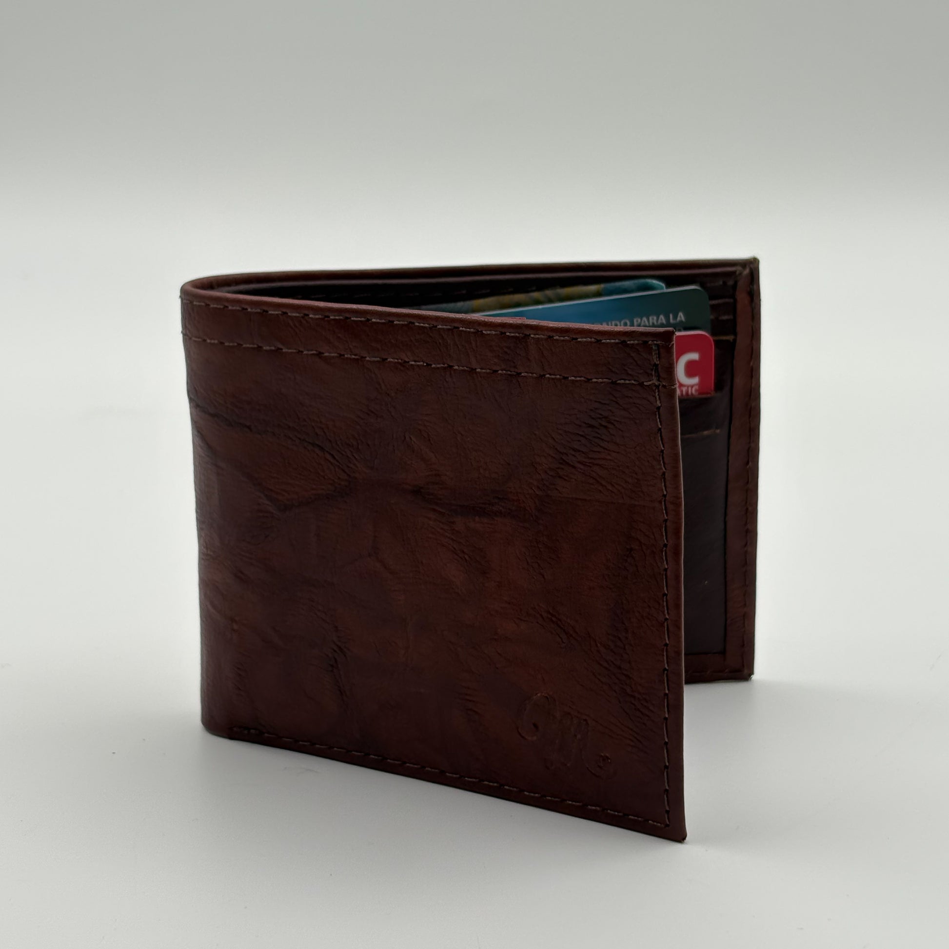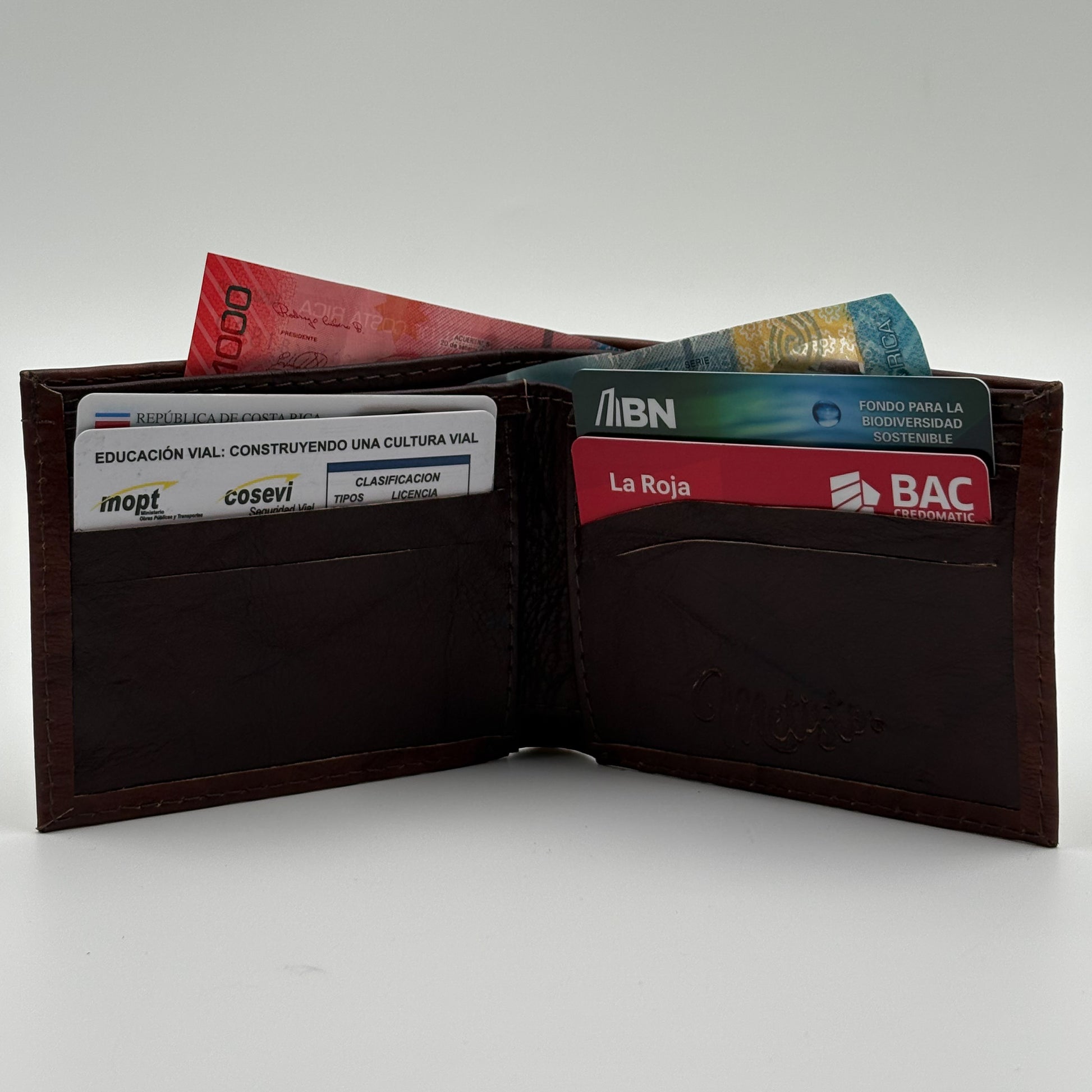 Presenta un contraste elegante entre su interior café oscuro y exterior en tono avellana, con acabados artesanales que reflejan la calidad del cuero costarricense.