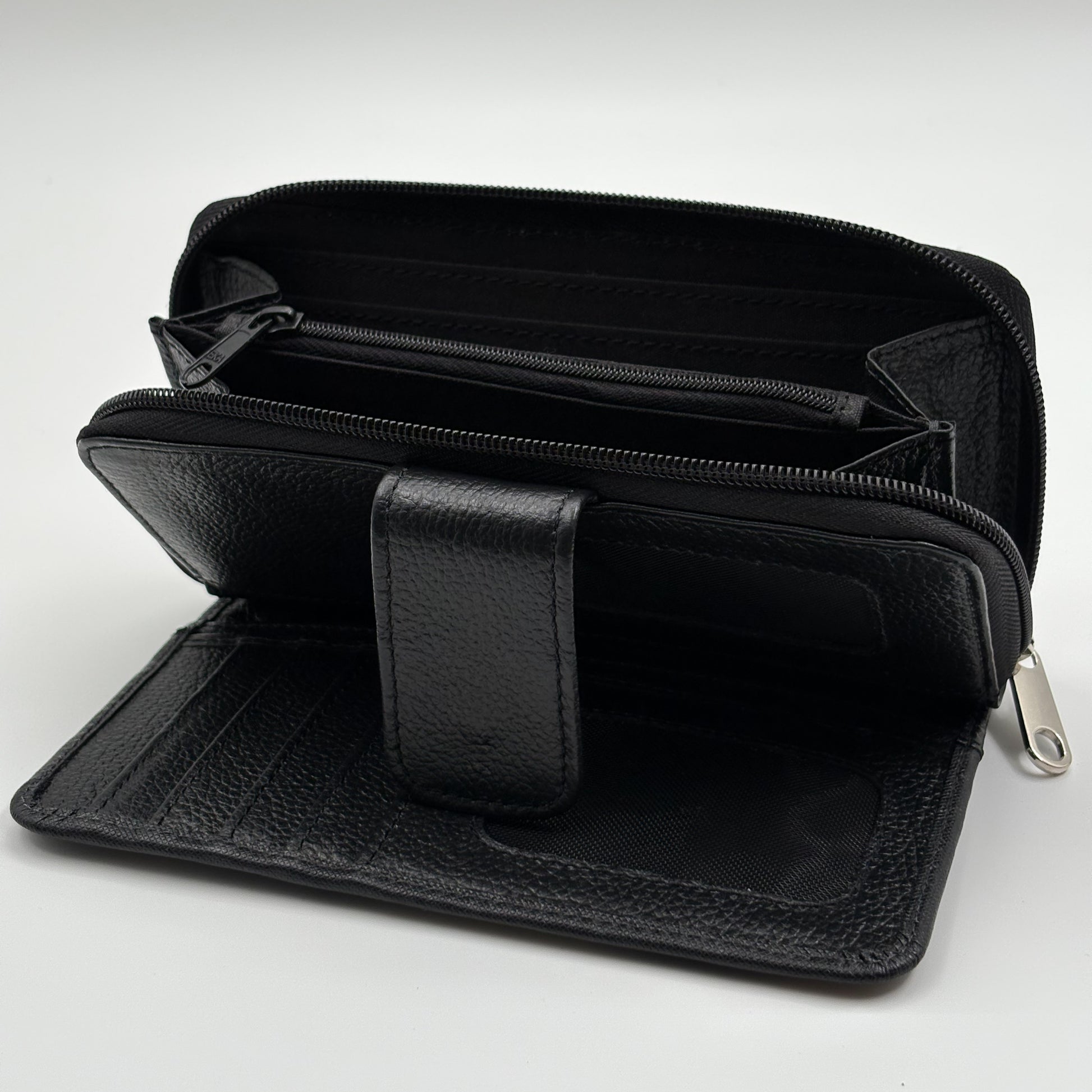 Capacidad: Compartimentos para billetes, múltiples ranuras para tarjetas, bolsillo con zipper y espacios laterales.