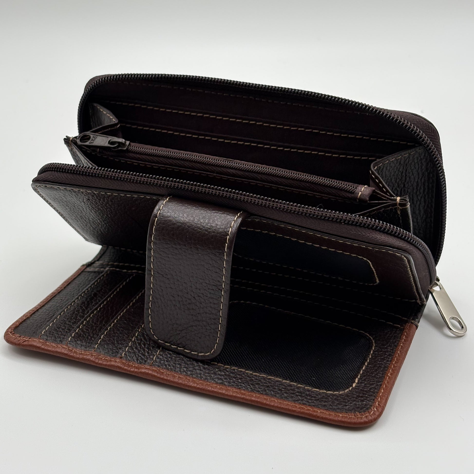 Capacidad: Compartimentos para billetes, múltiples ranuras para tarjetas, bolsillo con zipper y espacios laterales.