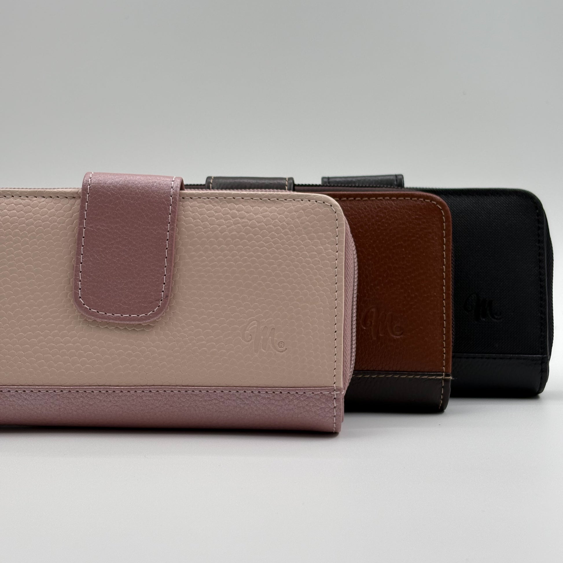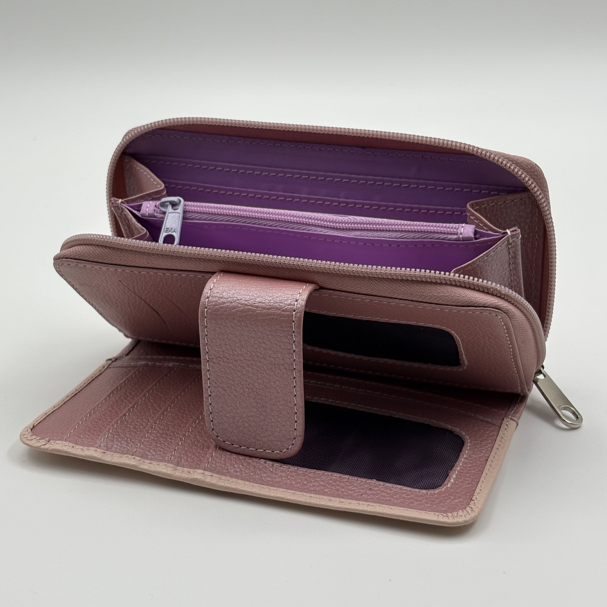 Capacidad: Compartimentos para billetes, múltiples ranuras para tarjetas, bolsillo con zipper y espacios laterales.