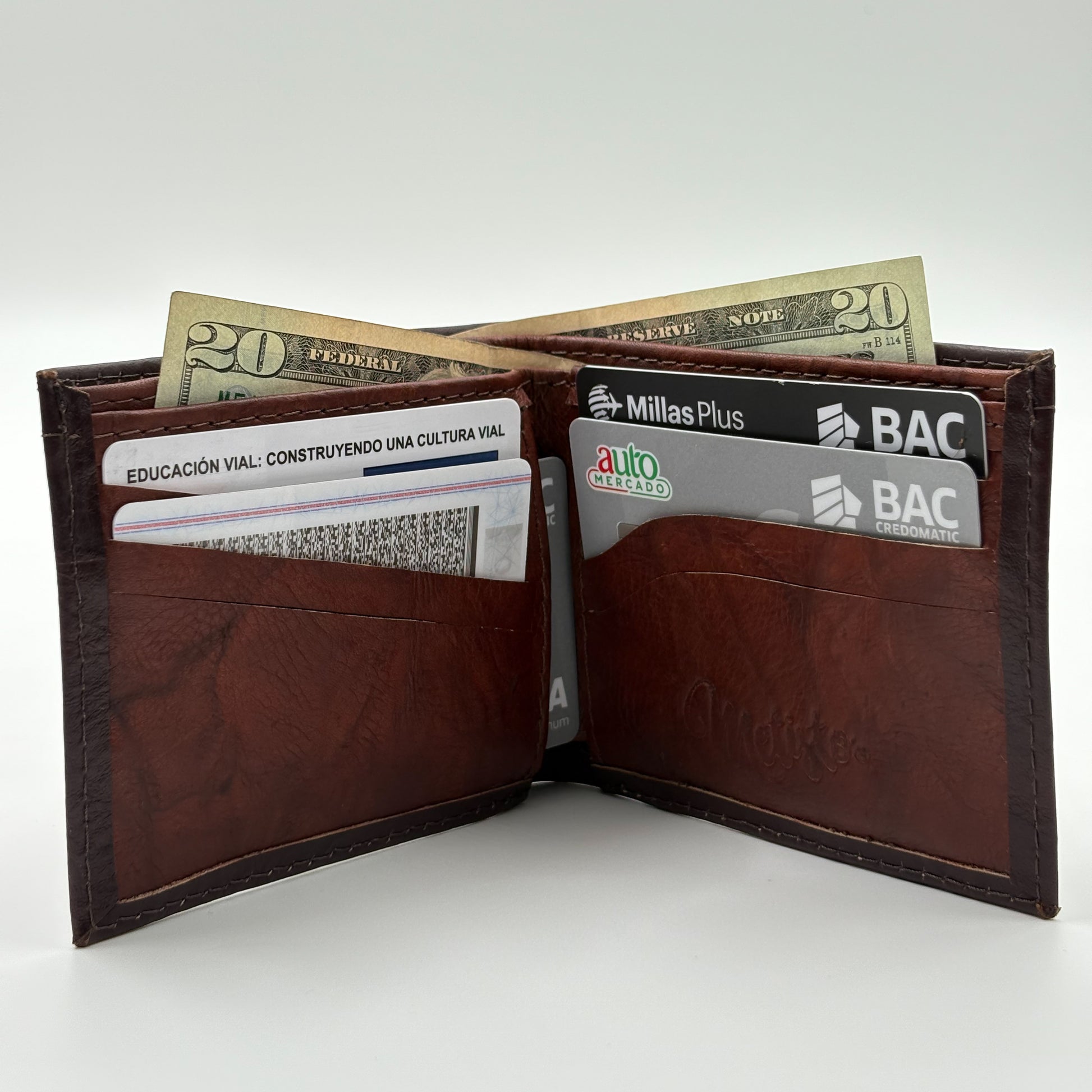 Capacidad: 6 ranuras para tarjetas, 2 compartimentos para billetes, 2 compartimentos pequeños a los lados para documentos o tarjetas adicionales.