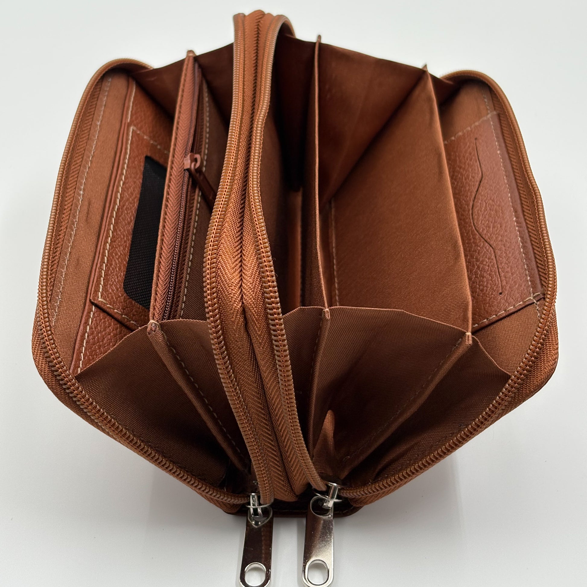Capacidad: 3 compartimentos amplios, 2 bolsillos centrales con zipper, ranuras para tarjetas y bolsillos ocultos.