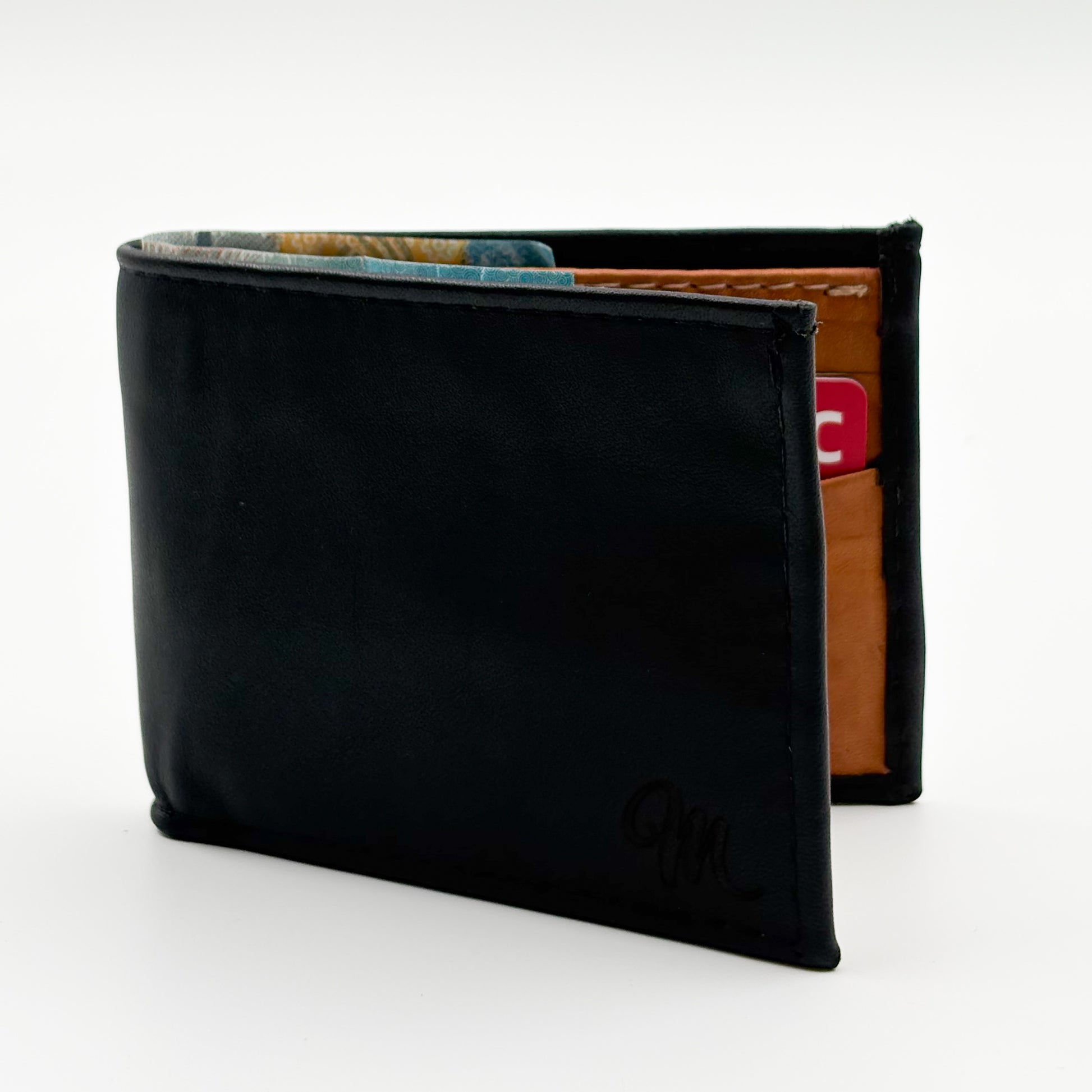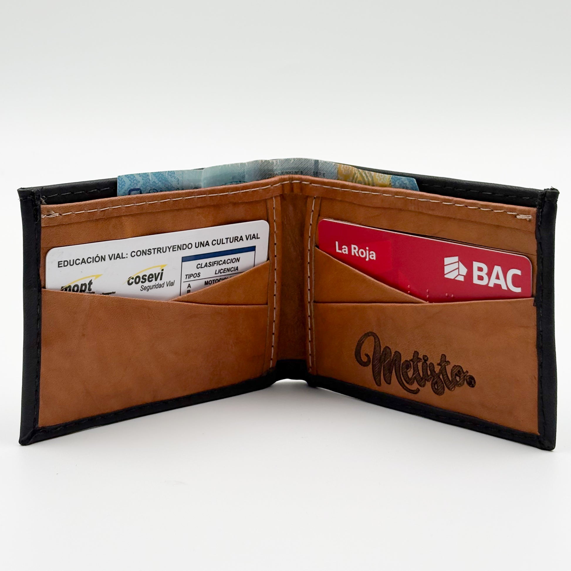Capacidad: 6 ranuras para tarjetas, 1 compartimento para billetes, 2 compartimentos pequeños a los lados para documentos o tarjetas adicionales.