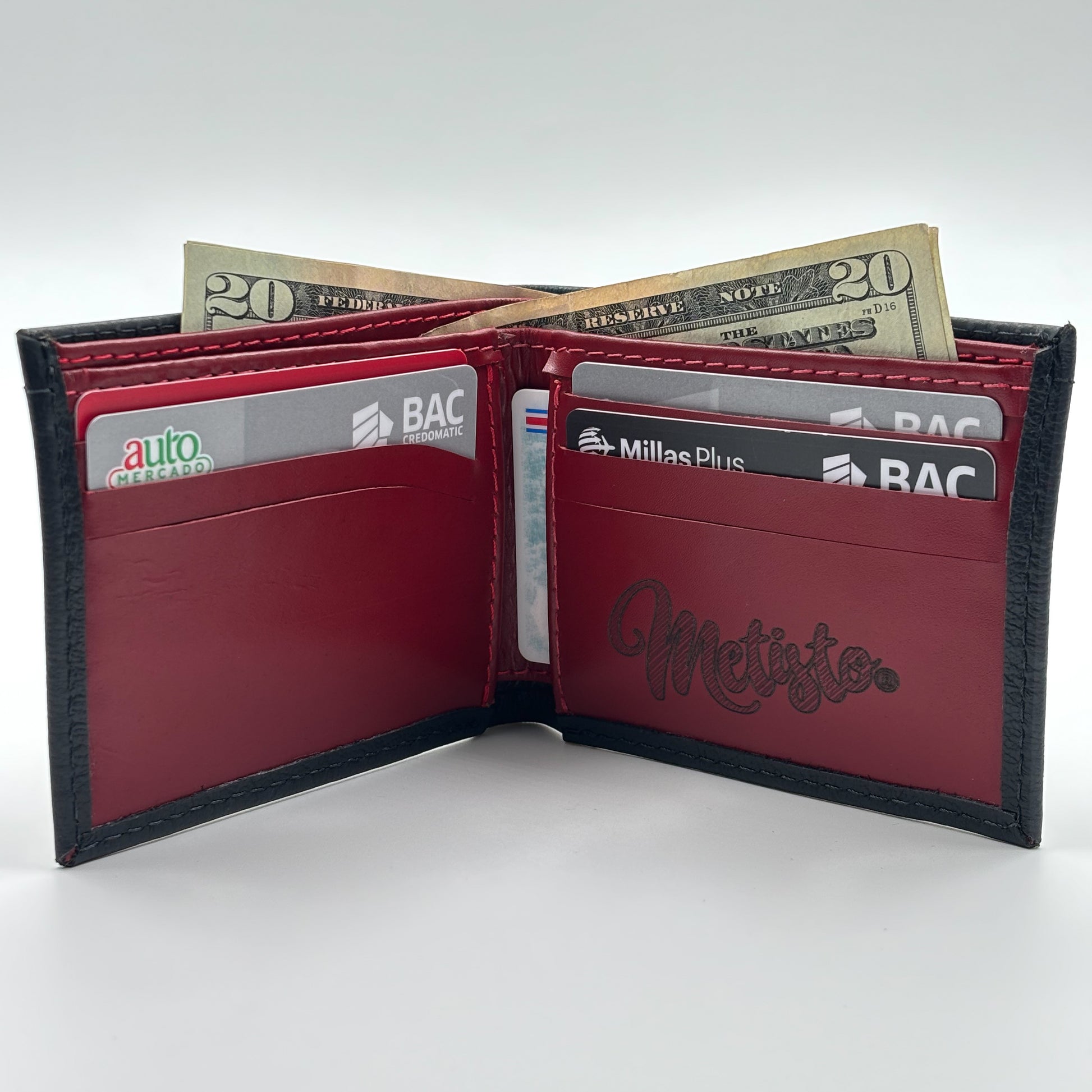 Capacidad: 6 ranuras para tarjetas, 2 compartimentos para billetes, 2 compartimentos pequeños a los lados para documentos o tarjetas adicionales.