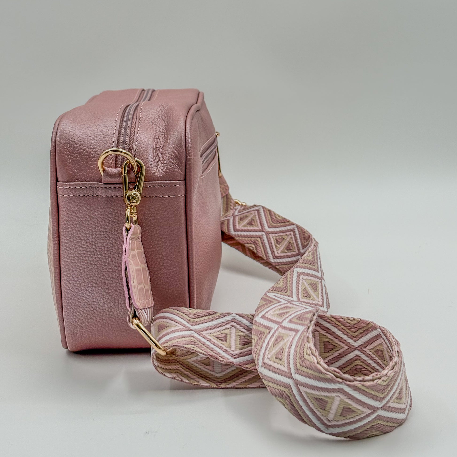 Bolso compacto en cuero genuino con textura tipo reptil rosada, suave y con un acabado delicado que lo hace moderno y sofisticado.