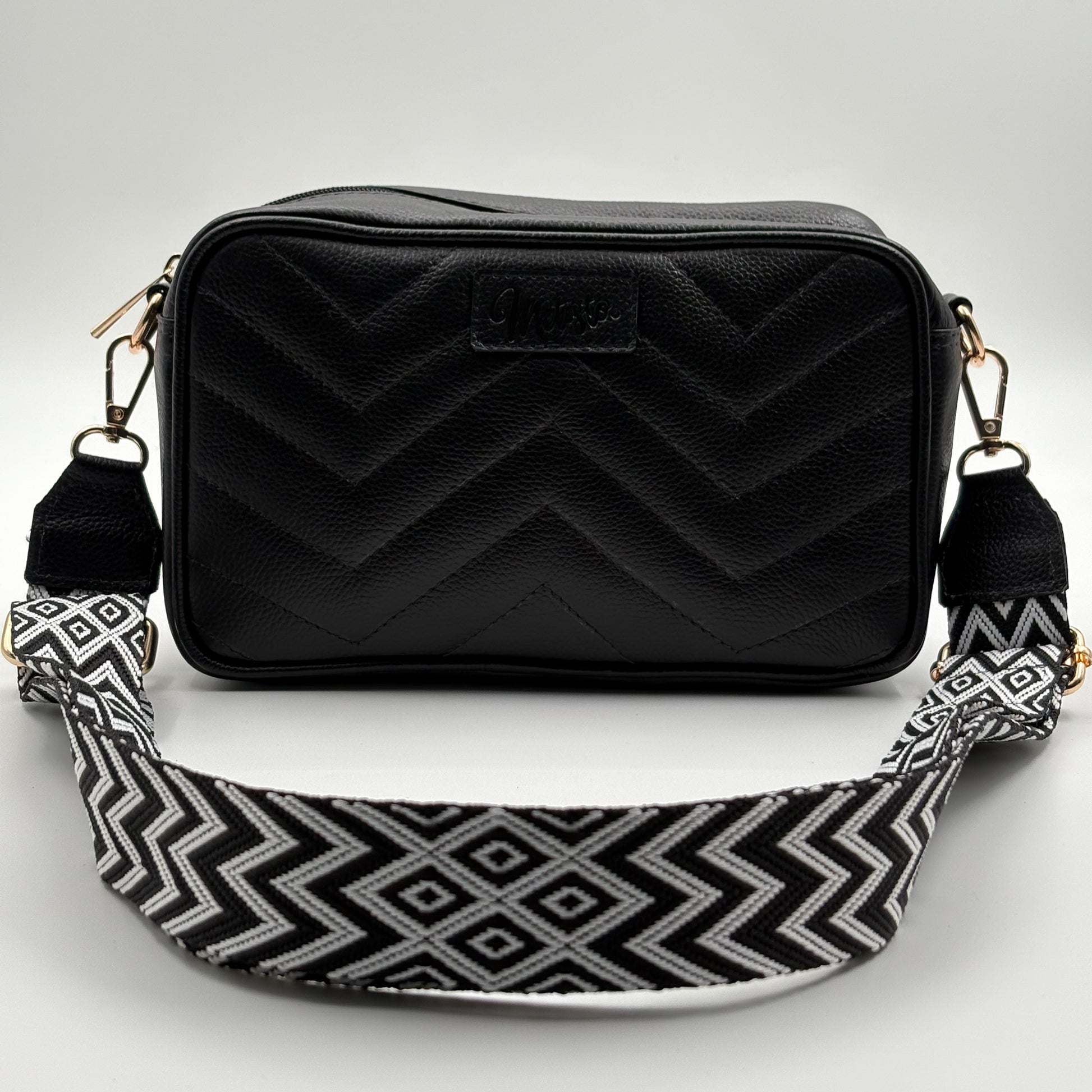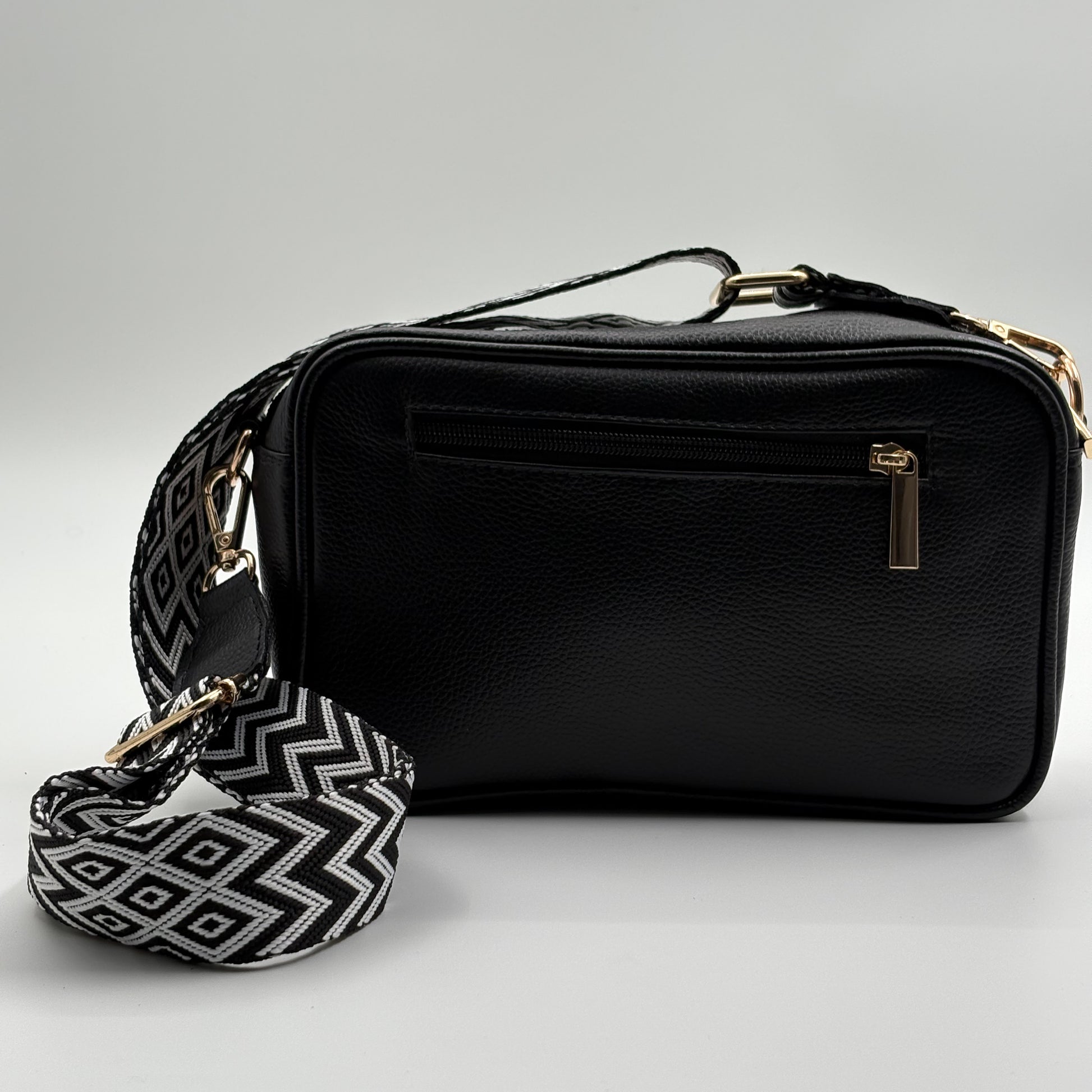 Bolso compacto en cuero genuino con correa ajustable estampada. Elegancia funcional para tu día a día.