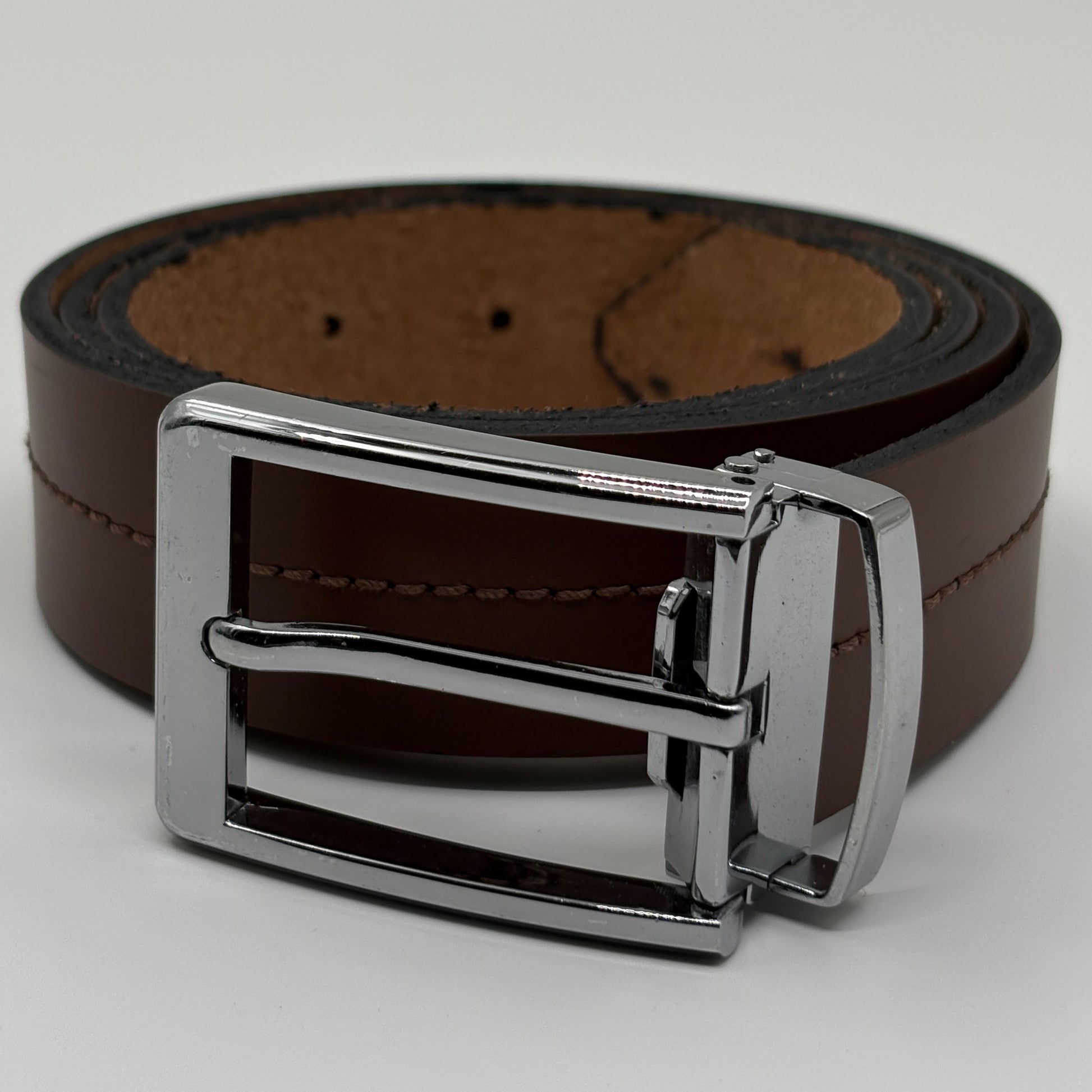 La hebilla plateada combina con la textura café media, ideal para looks profesionales o casuales con estilo.