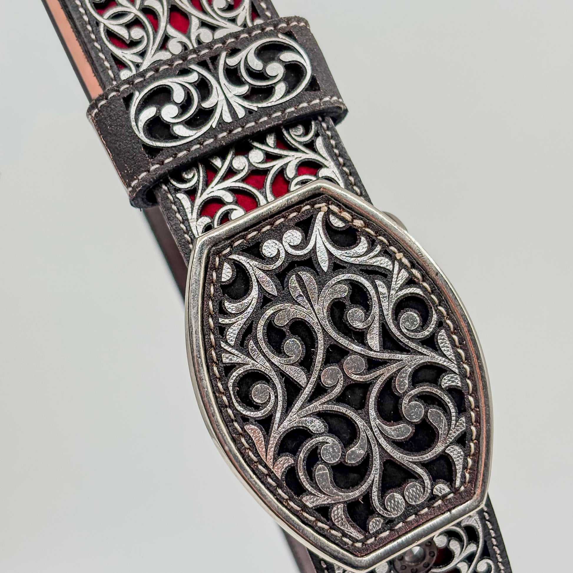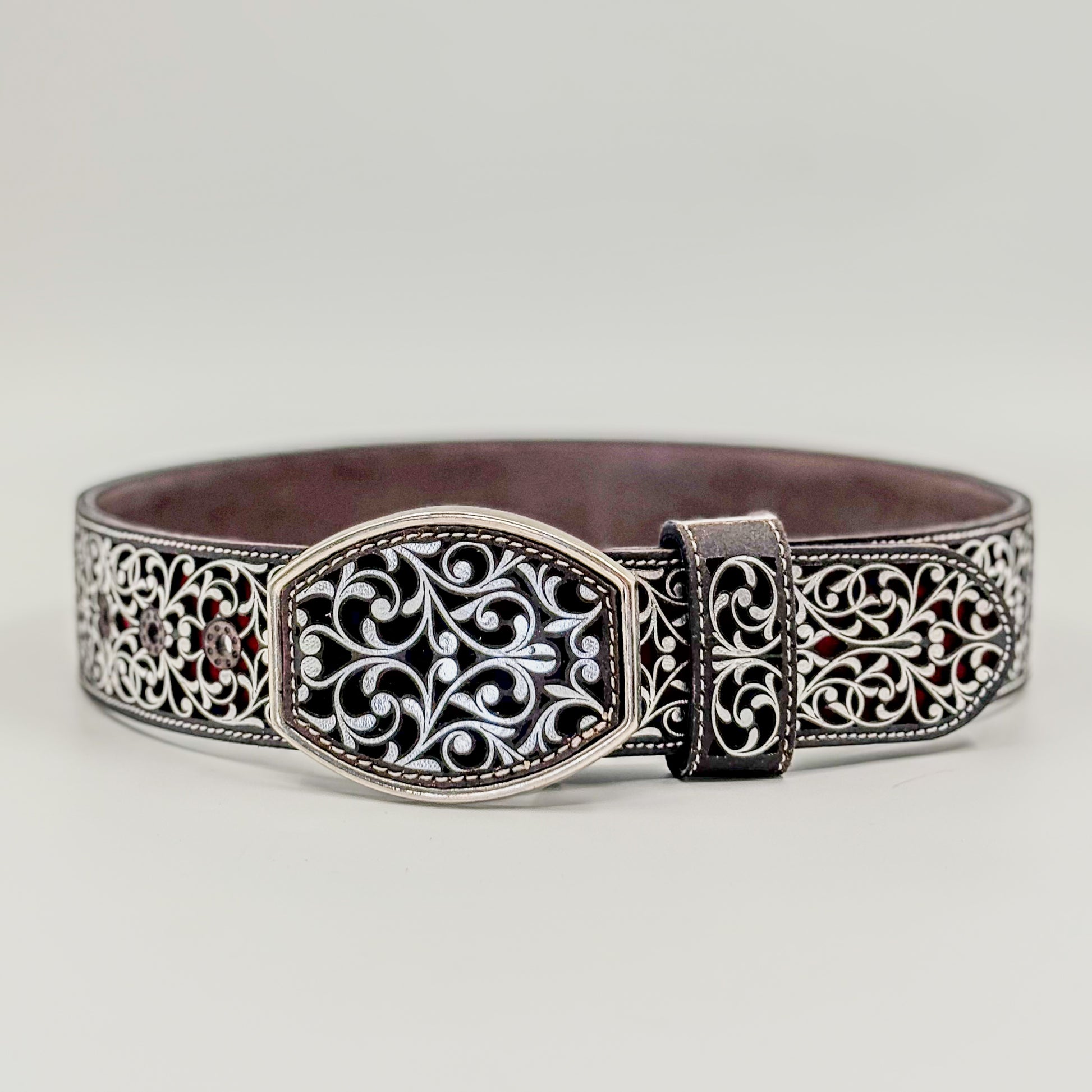 Elegante y llena de tradición, la Faja Herencia Mexicana Vino combina un delicado diseño ornamental plateado con el fondo color vino, evocando la riqueza cultural del arte mexicano.