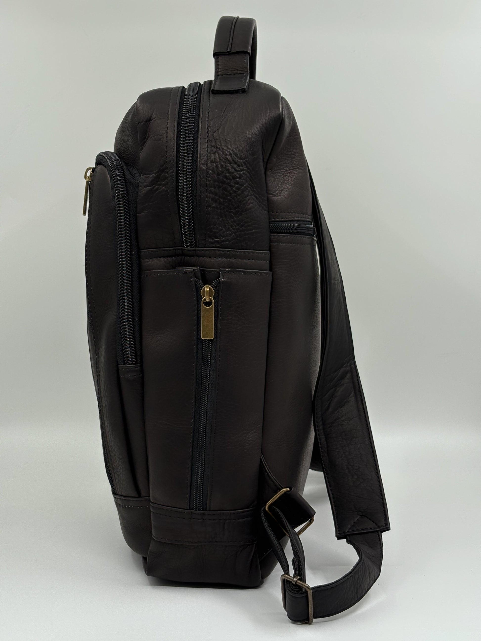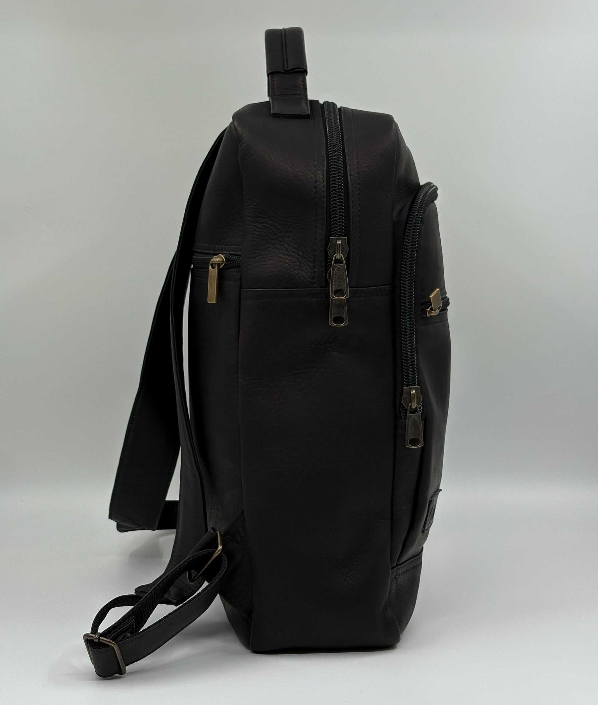 Mochila minimalista en cuero genuino, totalmente negra.