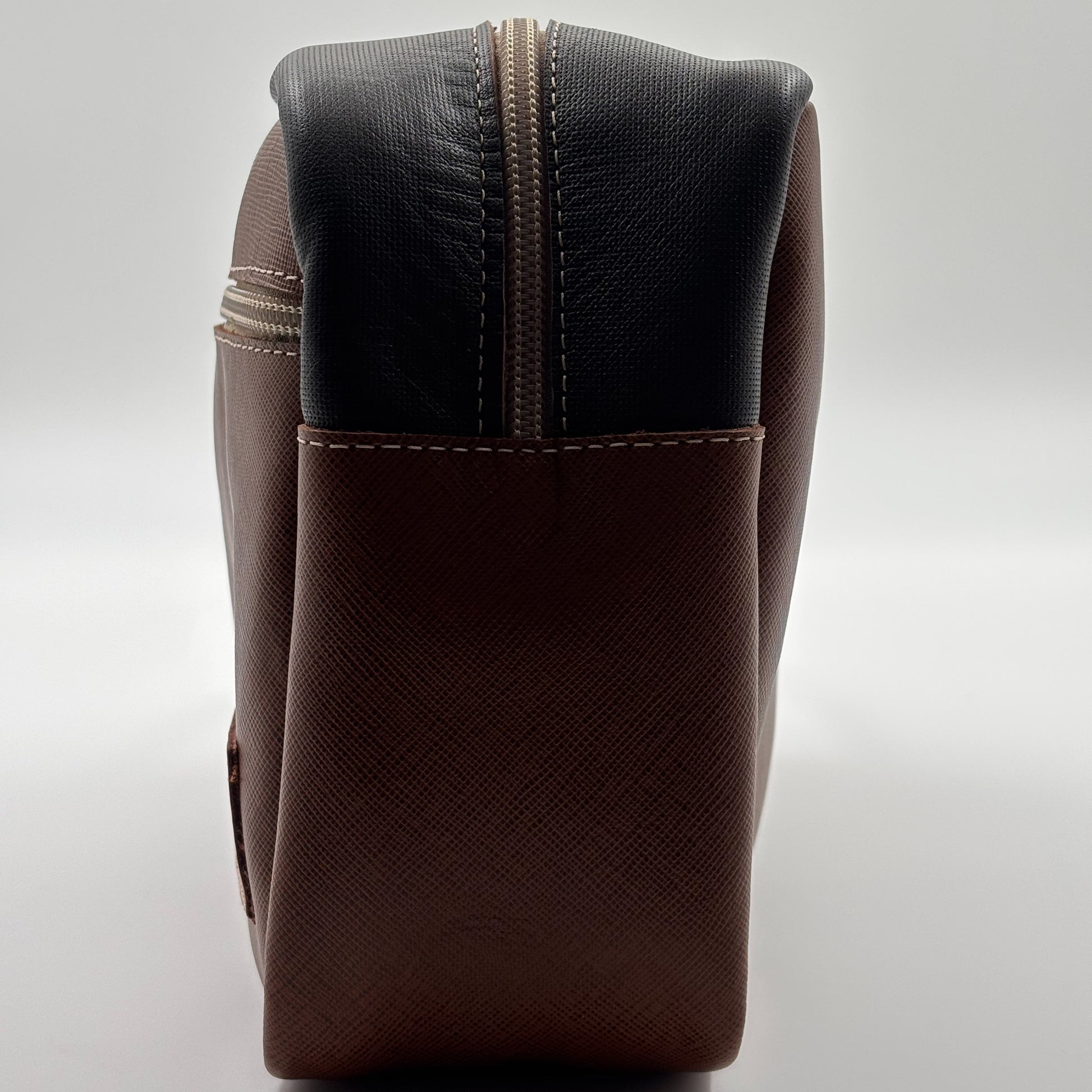 Diseño clásico en cuero legítimo café claro, con diseño bicolor y panel frontal en contraste. Interior amplio y estructura firme que conserva la forma incluso vacío.