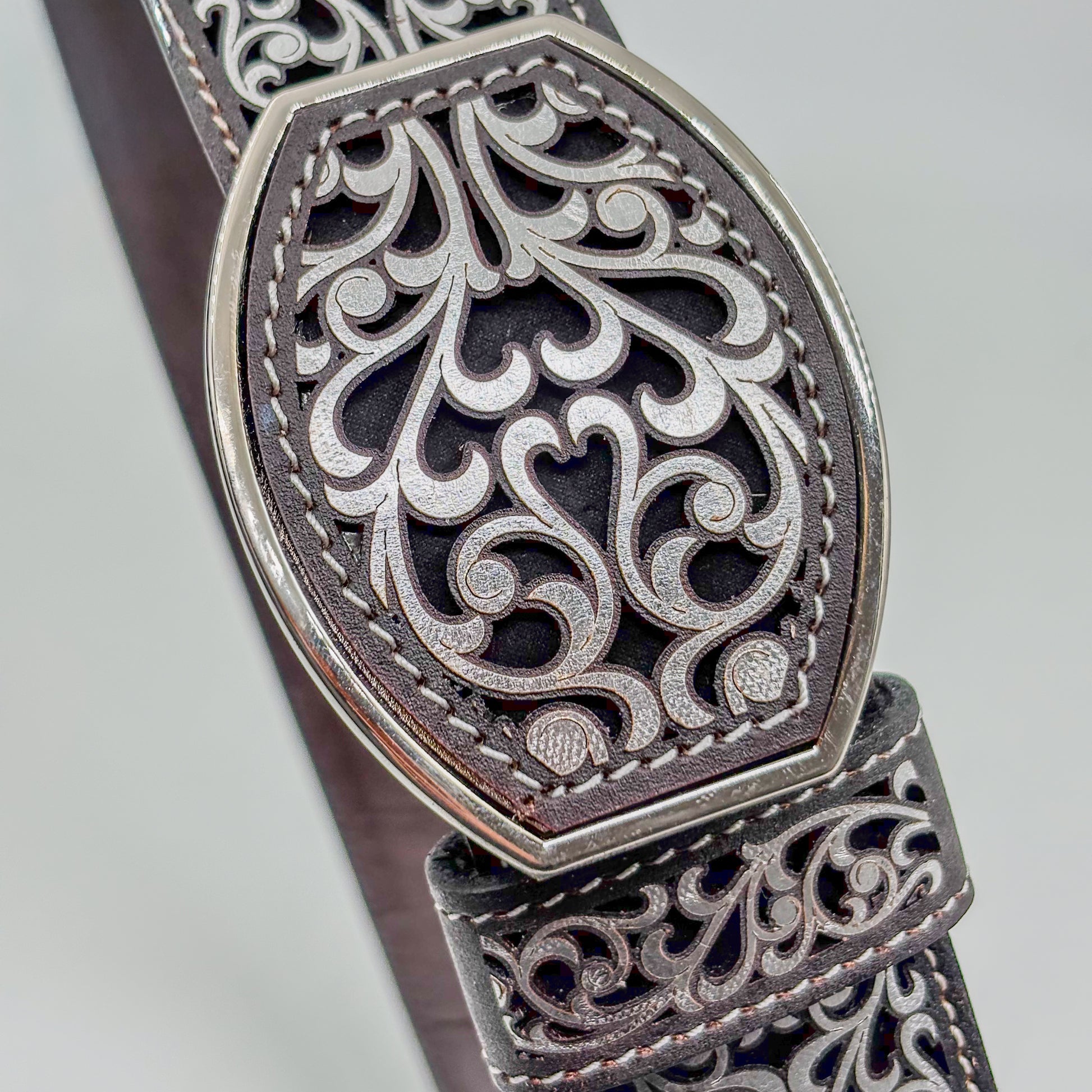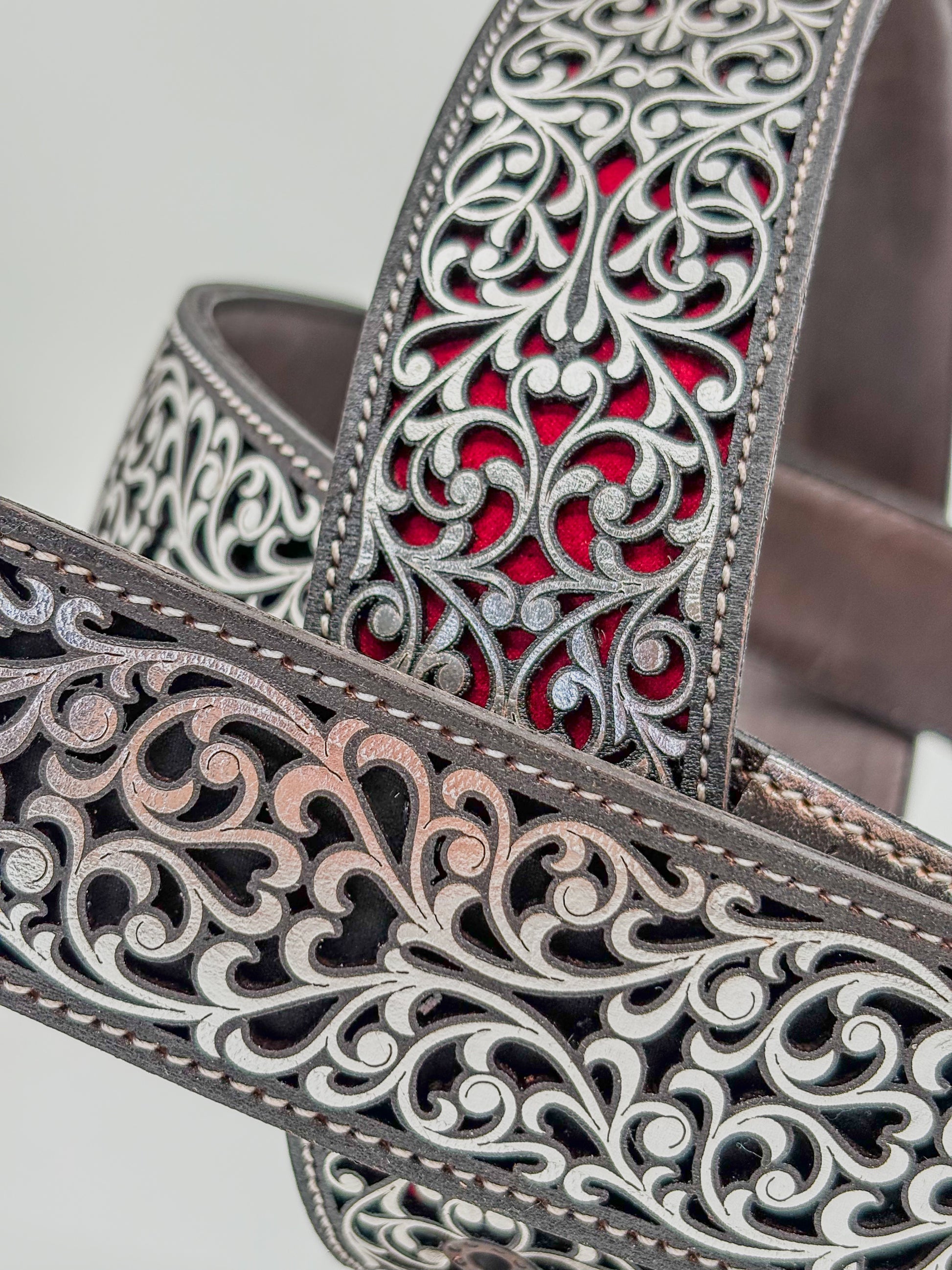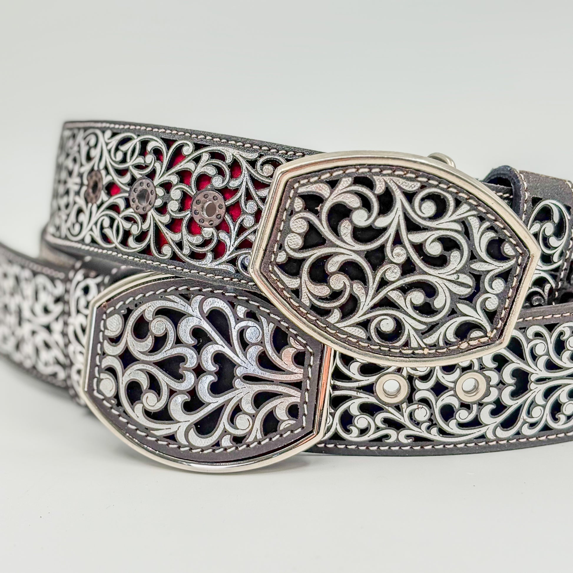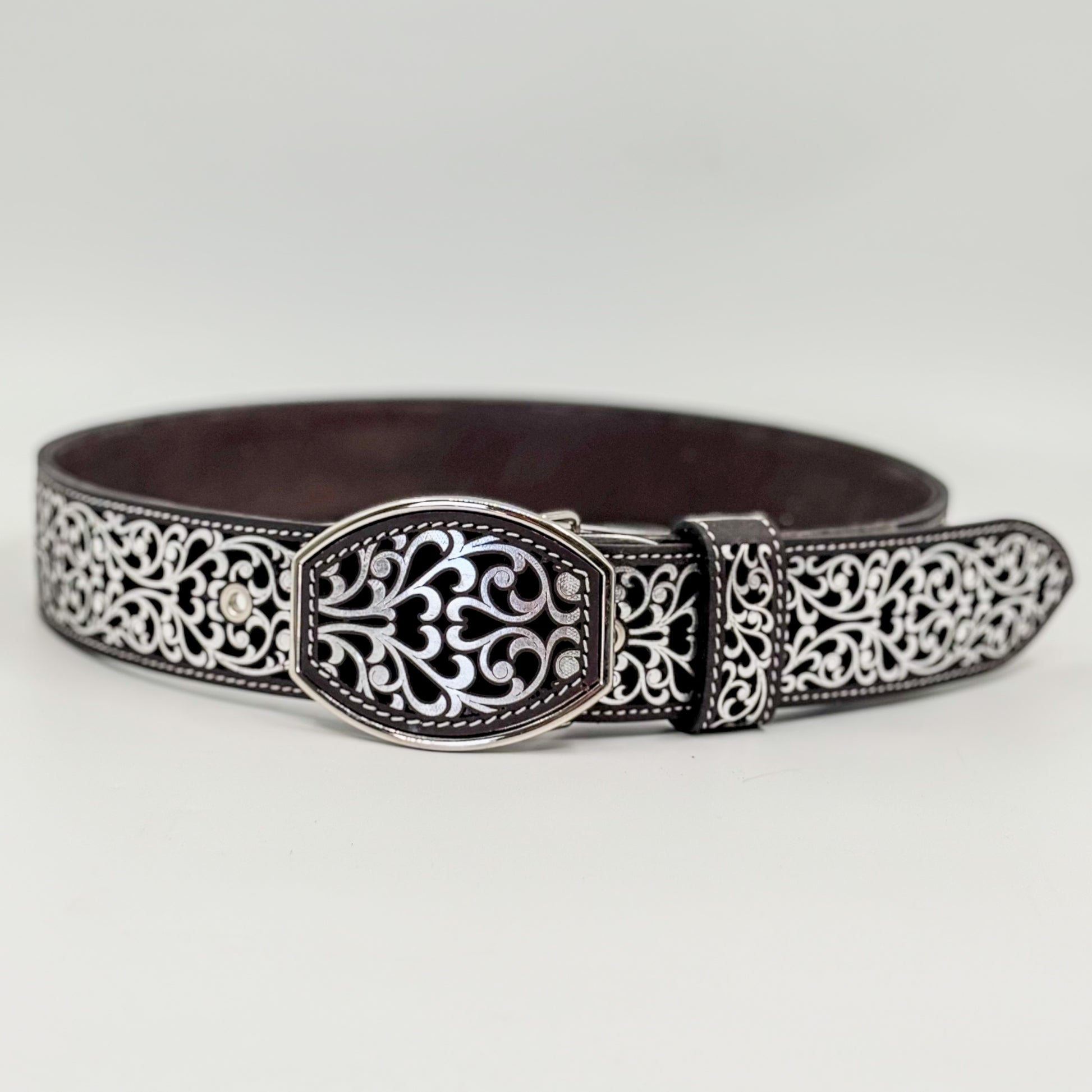 Sofisticada y atemporal, la Faja Herencia Mexicana Negra destaca por su diseño ornamental plateado que resalta sobre el cuero oscuro, logrando una combinación elegante y poderosa.