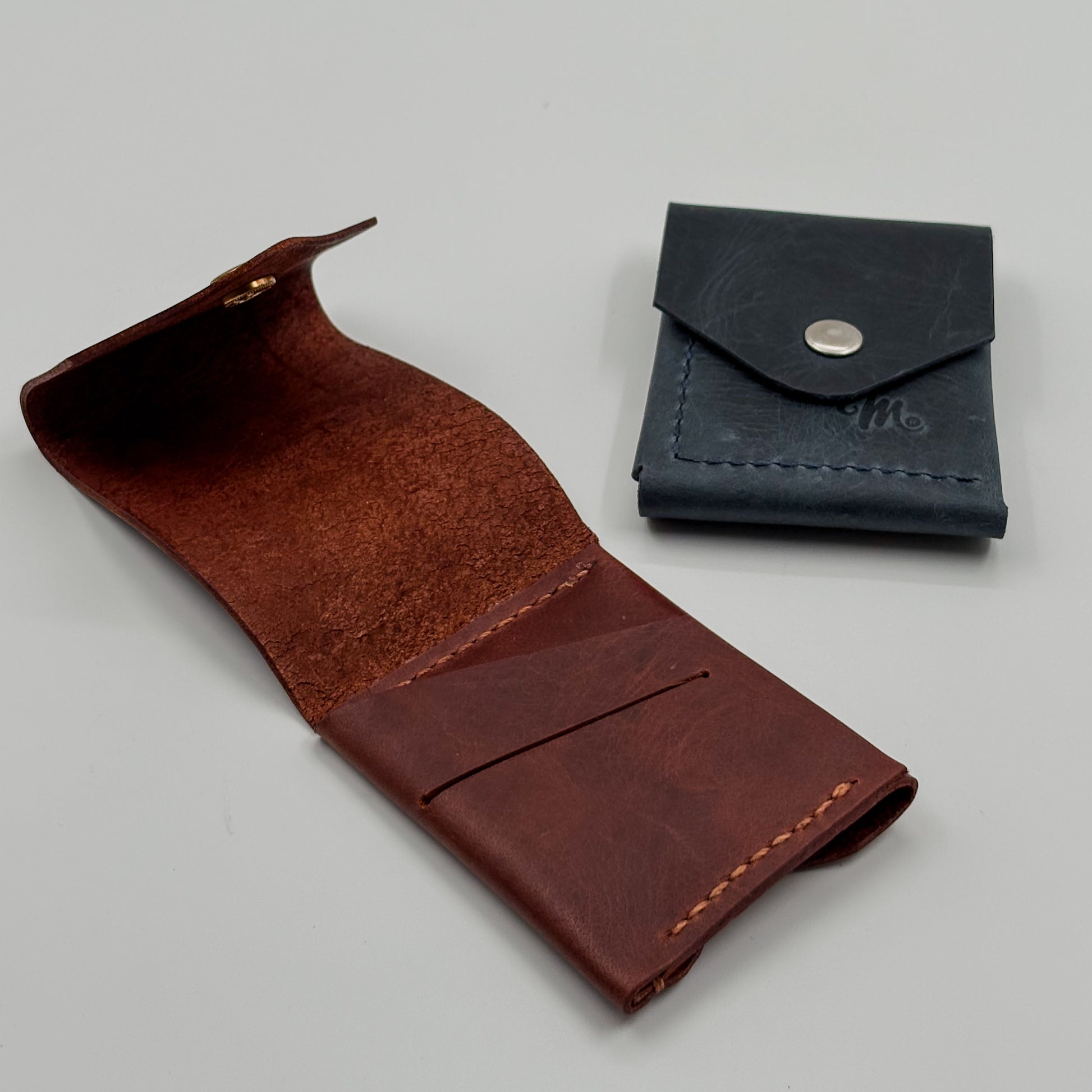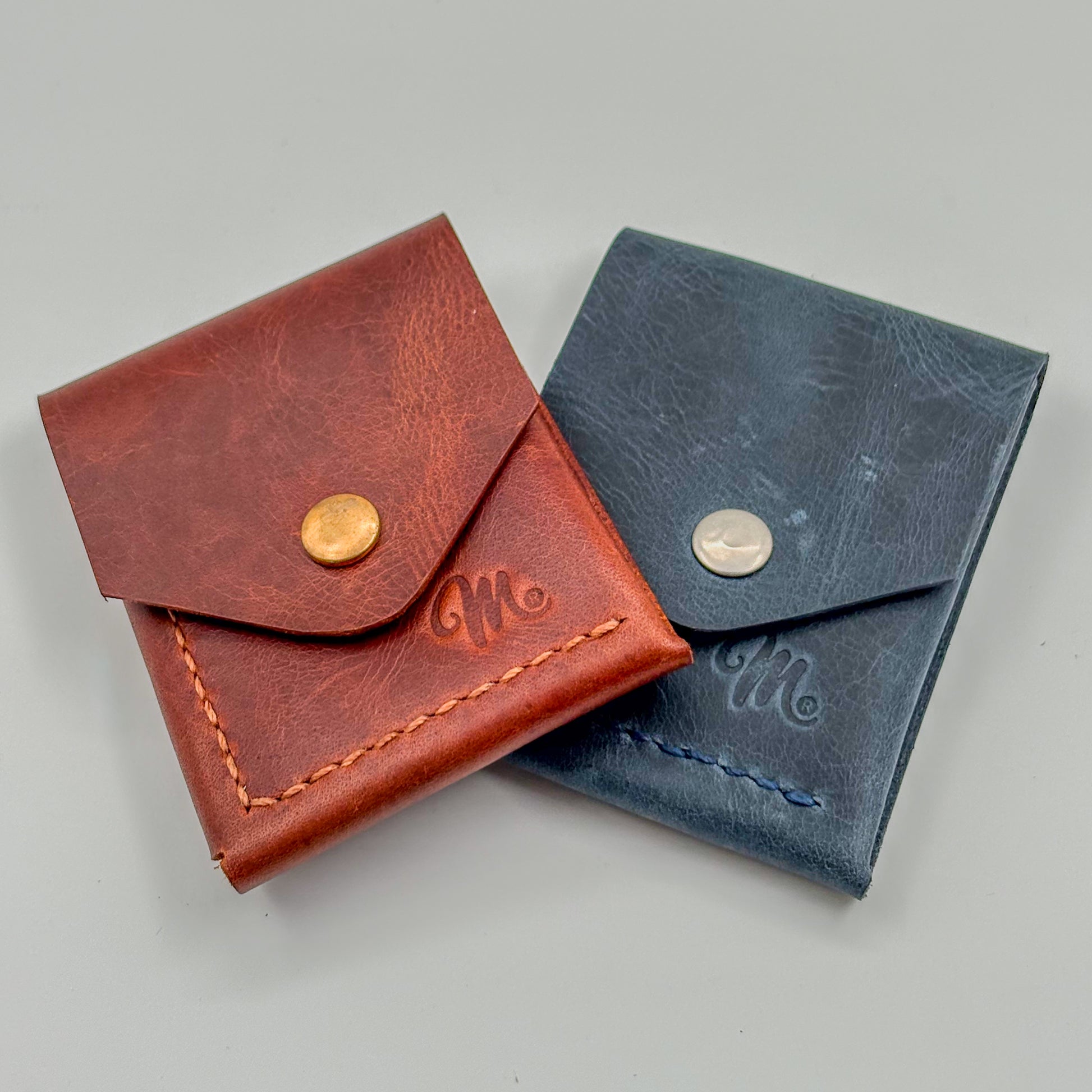 Disponible en azul y café, ambos con cierre metálico y estilo clásico con costuras visibles. Perfecto para uso diario o como regalo.