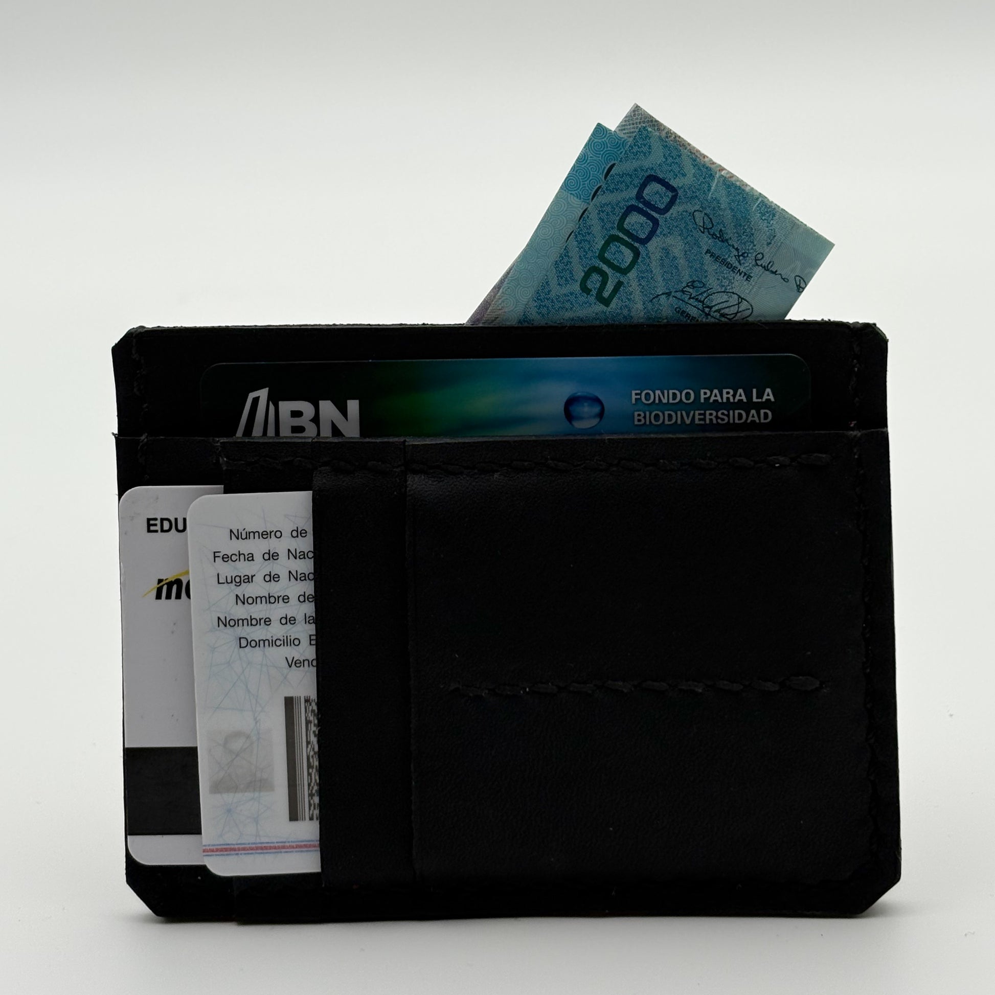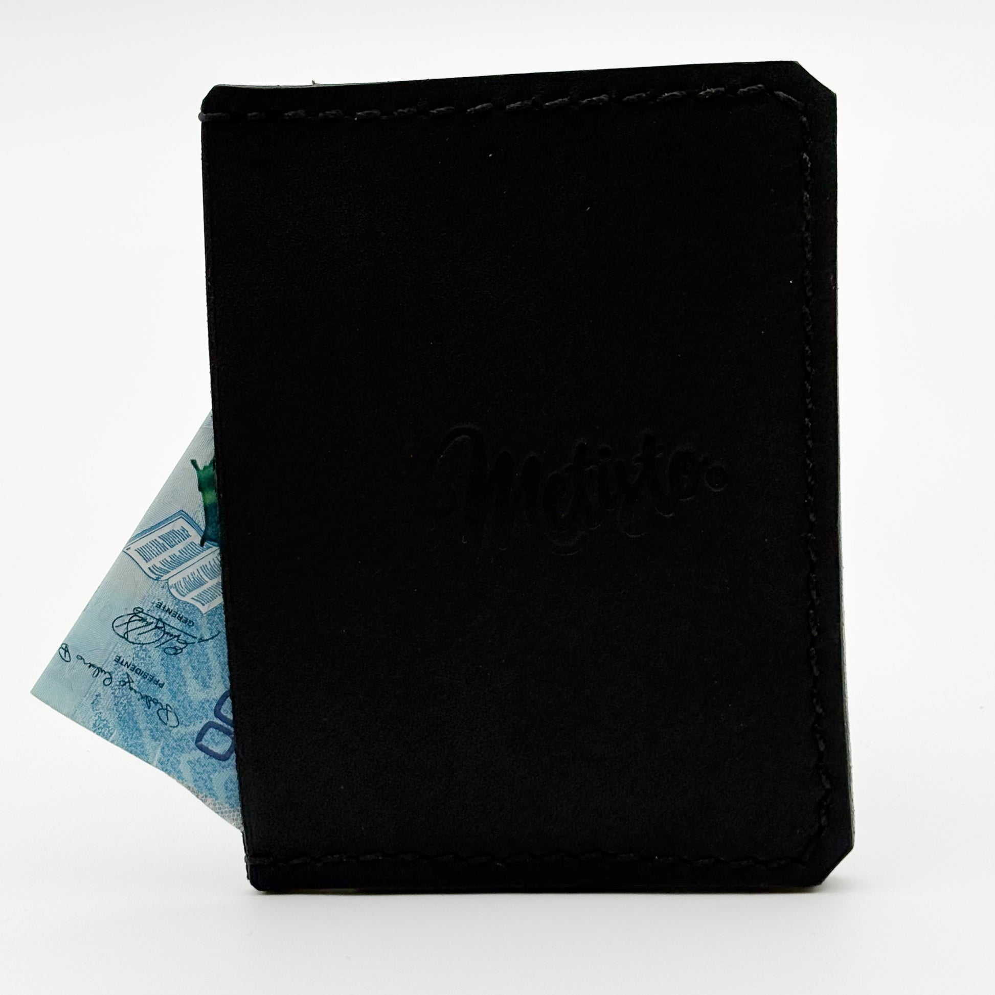 Este tarjetero en color negro combina diseño compacto con un acabado moderno. Perfecto para guardar tus esenciales sin ocupar espacio de más. Ideal como complemento de bolso o para usar directamente en el bolsillo.